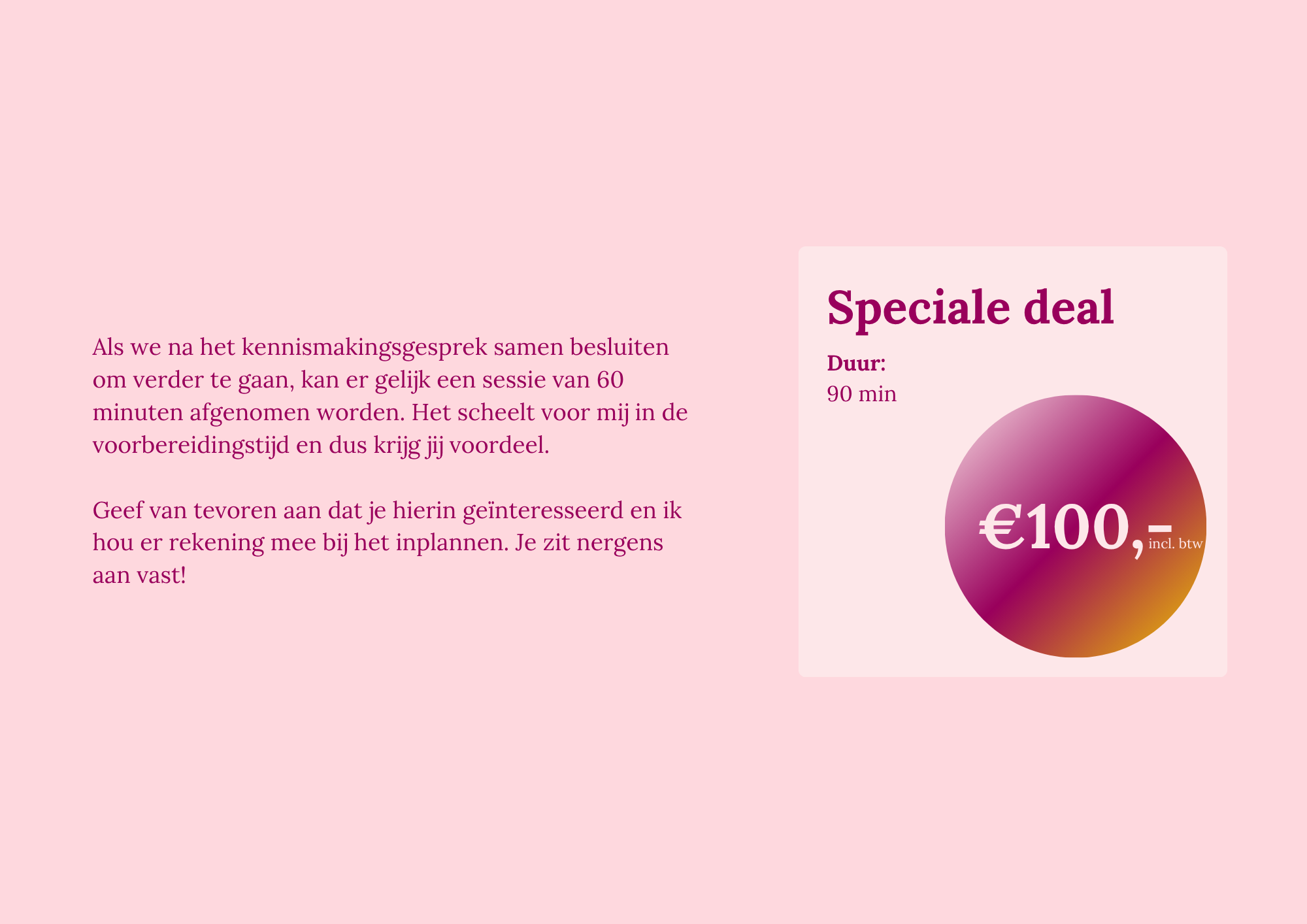Door mijn zelfervaring en kennis weet ik wat nodig is: stap voor stap, op jouw tempo, onderzoeken en laagjes er afpellen, zodat je weer in contact komt met je eigen zelf en wijsheid. Je komt weer in verbinding met wie je bent en kan hieruit gaan handelen. Je voelt je gehoord, begrepen, je weet welke signalen je lichaam afgeeft en bent in contact met je innerlijke leefwereld.